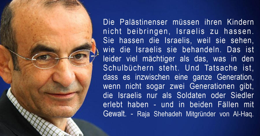 Die Palästinenser müssen ihren Kindern nicht beibringen, Israelis zu hassen. Sie hassen die Israelis, weil sie sehen, wie die Israelis sie behandeln. Das ist leider viel mächtiger als das, was in den Schulbüchern steht. Und Tatsache ist, dass es inzwischen eine ganze Generation, wenn nicht sogar zwei Generationen gibt, die Israelis nur als Soldaten oder Siedler erlebt haben - und in beiden Fällen mit Gewalt.