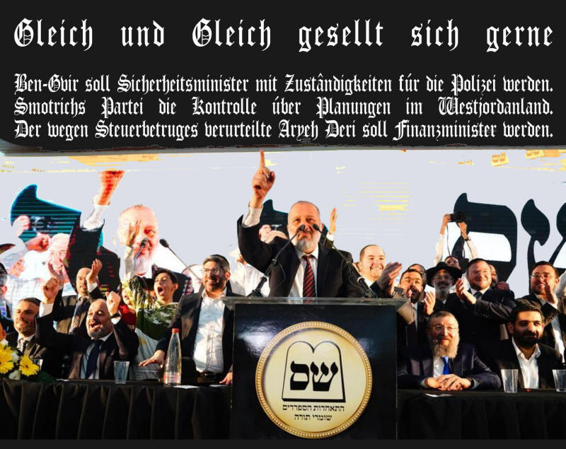 Nach Ansicht von Aryeh Deri, dem Mitbegründer und Vorsitzenden der sephardischen, ultraorthodoxen Schas-Partei, der in der kommenden Regierung sowohl Innen- als auch Gesundheitsminister sein wird, ist physische Gewalt des Staates gegen Palästinenser nicht genug. In einer Schas-Werbung, die im Vorfeld der Wahlen im November veröffentlicht wurde, prahlte Deri mit seiner Arbeit in früheren Regierungen, die darauf abzielte, Palästinensern in Israel die Staatsbürgerschaft zu entziehen, wenn sie des "Terrorismus" überführt wurden (wie seine Kollegen definiert Deri den Begriff nicht). "Das ist die beste Abschreckung: ihnen die Staatsbürgerschaft zu entziehen. Davor haben sie am meisten Angst - übrigens mehr als vor der Zerstörung ihrer Häuser. Das ist das wirksamste Mittel des Shabak [Shin Bet]."