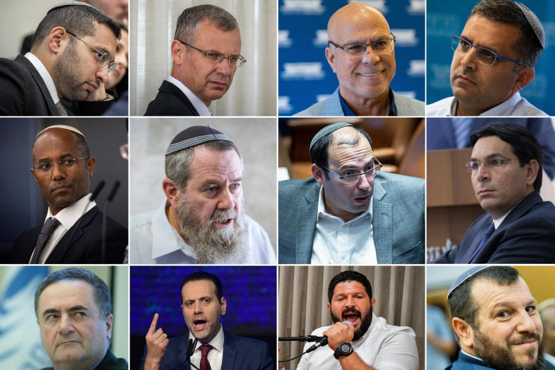 Mitglieder der neuen Knesset. Obere Reihe von links nach rechts: Yitzhak Wasserlauf, Yariv Levin, Zvika Fogel, Ofir Sofer; mittlere Reihe von links nach rechts: Moshe Solomon, Avi Maoz, Simcha Rothman, Danny Danon; untere Reihe von links nach rechts: Yisrael Katz, Miki Zohar, Almog Cohen, Amichai Eliyahu. (Flash90)