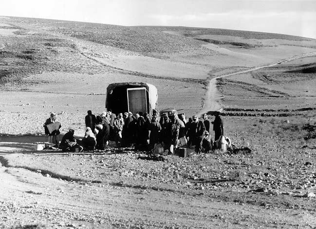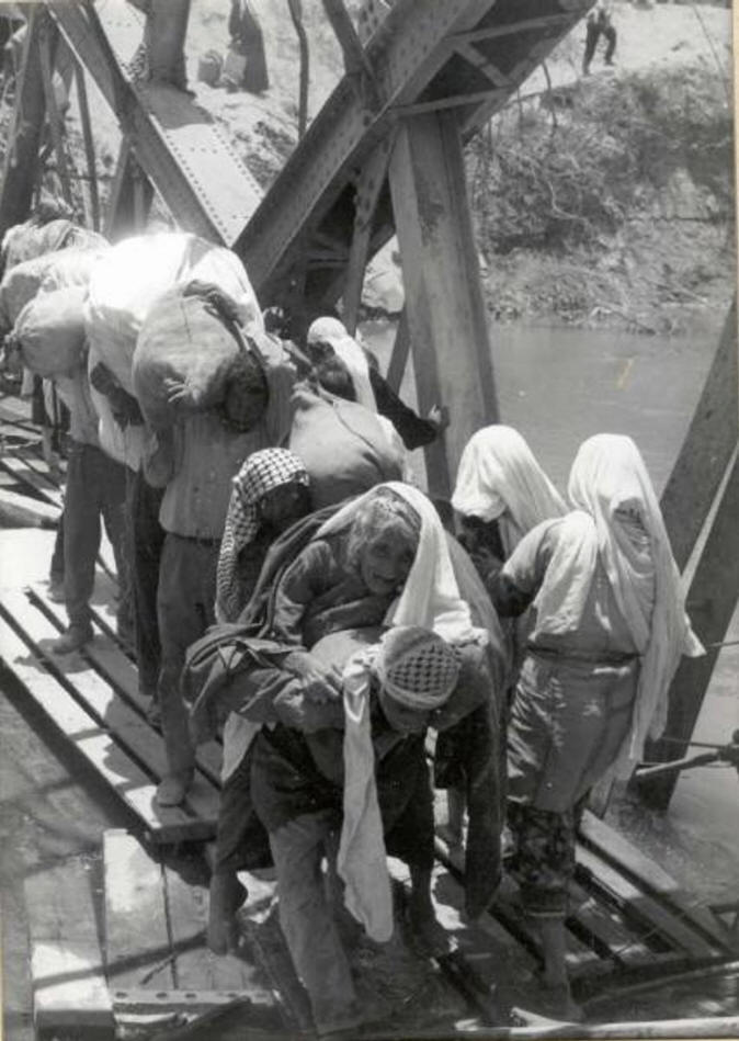 Palästinensische Flüchtlinge tragen ihre Habseligkeiten, als sie sich nach der israelischen Invasion des Westjordanlandes am 22. Juni 1967 darauf vorbereiten, die Allenby-Brücke über den Jordan zu überqueren.