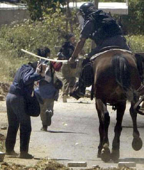 einer Polizistin fing mich ab. Sie schlug mit ihrem Stock auf meinen Kopf.