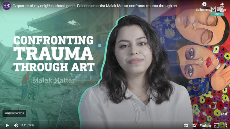 "Ich bin Malak Mattar, eine Palästinenserin aus Gaza. Ich begann 2014 zu malen, als der 51-tägige israelische Angriff tobte, um all meine negative Energie loszuwerden." Ich lebe derzeit in Istanbul, wo ich studiere und male.