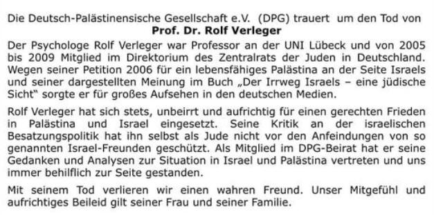 Aus diesem Geist heraus hat sich Rolf Verleger immer wieder mit seinem kritischen Intellekt, seiner humanitären Gesinnung und seinem hohen moralischen Anspruch in die politische Debatte über Israel und den Nahen Osten eingemischt. Seine Stimme, die nun verstummt ist, ist für uns ein unersetzbarer Verlust.